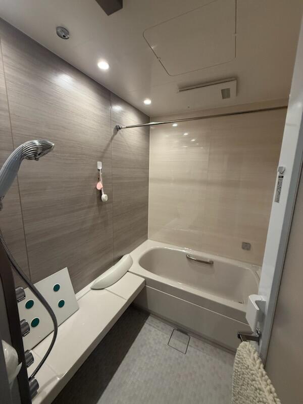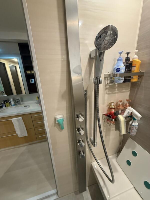 デザイン性では、オーバーヘッドシャワーのアクアタワーや打たせ湯など、スパのように充実なお風呂時間をお家でも楽しめるように。 清掃性では、鏡を無くしノイズレスな器具面にするため、浴室ドア横の小窓に壁を造作し水栓を配置しております。 将来性では、洗い場のカウンターを風呂椅子にし足腰が不自由になった場合でも安心して使える仕様にするなど、見た目だけではなく機能性も備えた浴室への変更をしております。