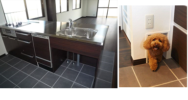 リビングはフローリングで、キッチン部分の床には犬が冷たい床が好きだからとタイルを選択。