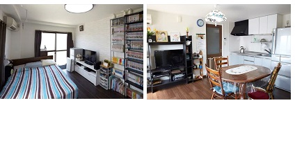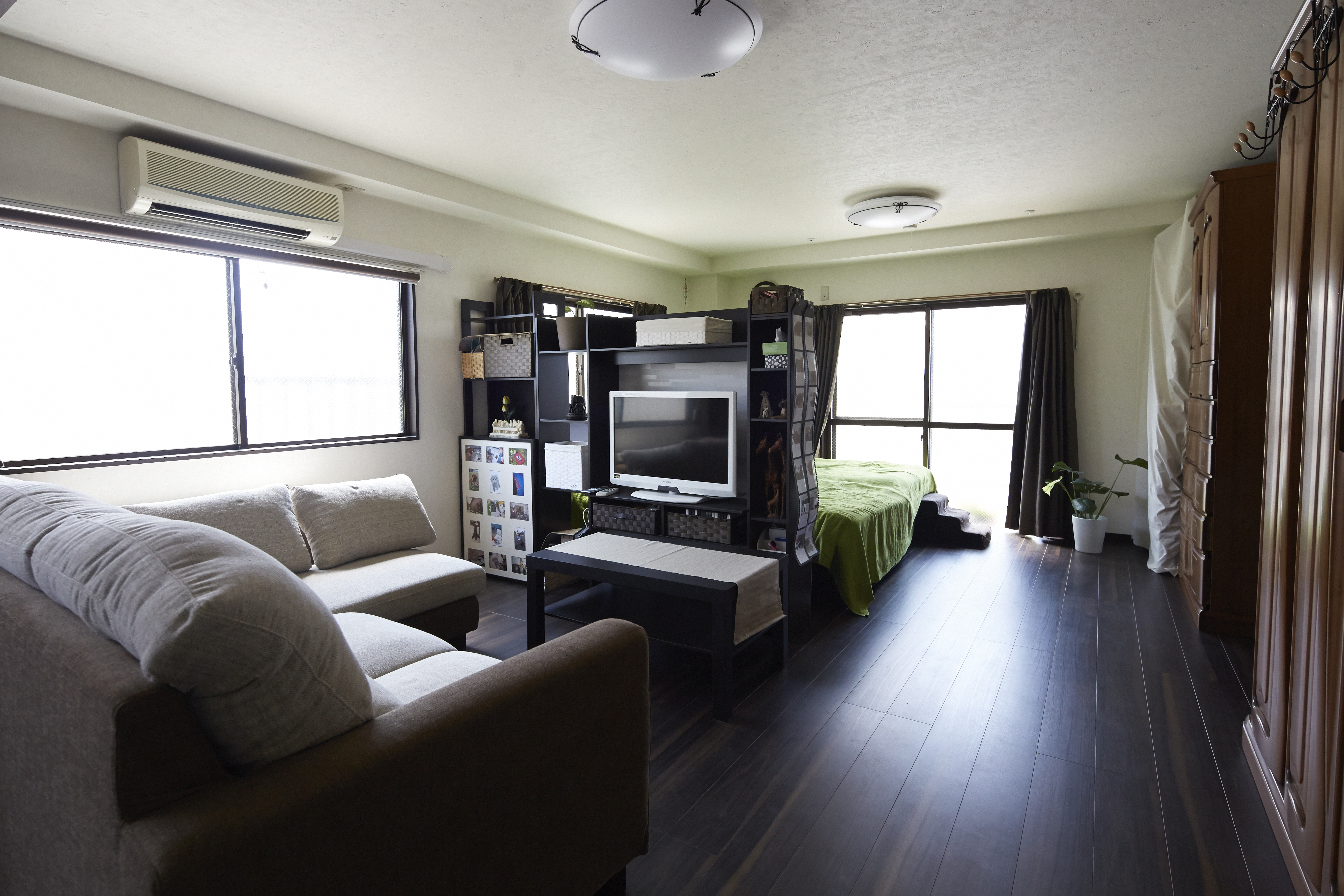 壁を取り去って広くしたリビングは、TV台をパーティションにして、奥を夫婦の寝室にしています。大学生の長男が独立したら、長男の部屋を夫婦の寝室にと考えて、あえて独立した寝室を設置せず、フレキシブルに家族の変化に対応しています。