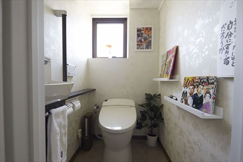 スッキリ見せるタンクレストイレと飾り棚によって、オシャレなカフェのトイレのよう。お風呂と同じく、じっくり検証して取りつけられた手すりが、お母様にもお祖母様にも使いやすい空間を実現しました。