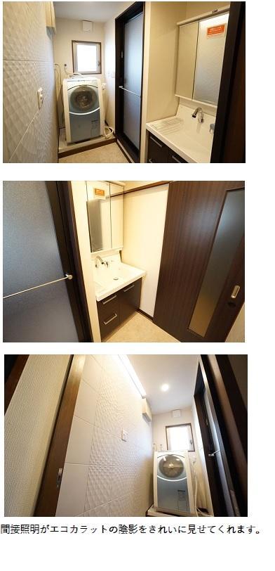 洗面脱衣所の間取りは変えずに、器具を交換し、内装も一新しました。天井には間接照明を作り、エコカラットの陰影が浮き出るよう演出。また室内引き戸も新しくし、デザインも変えました。エコカラットを洗面所に張ると、空気がカラッとし、気持ちの良い空間になります。マネしたい空間です。