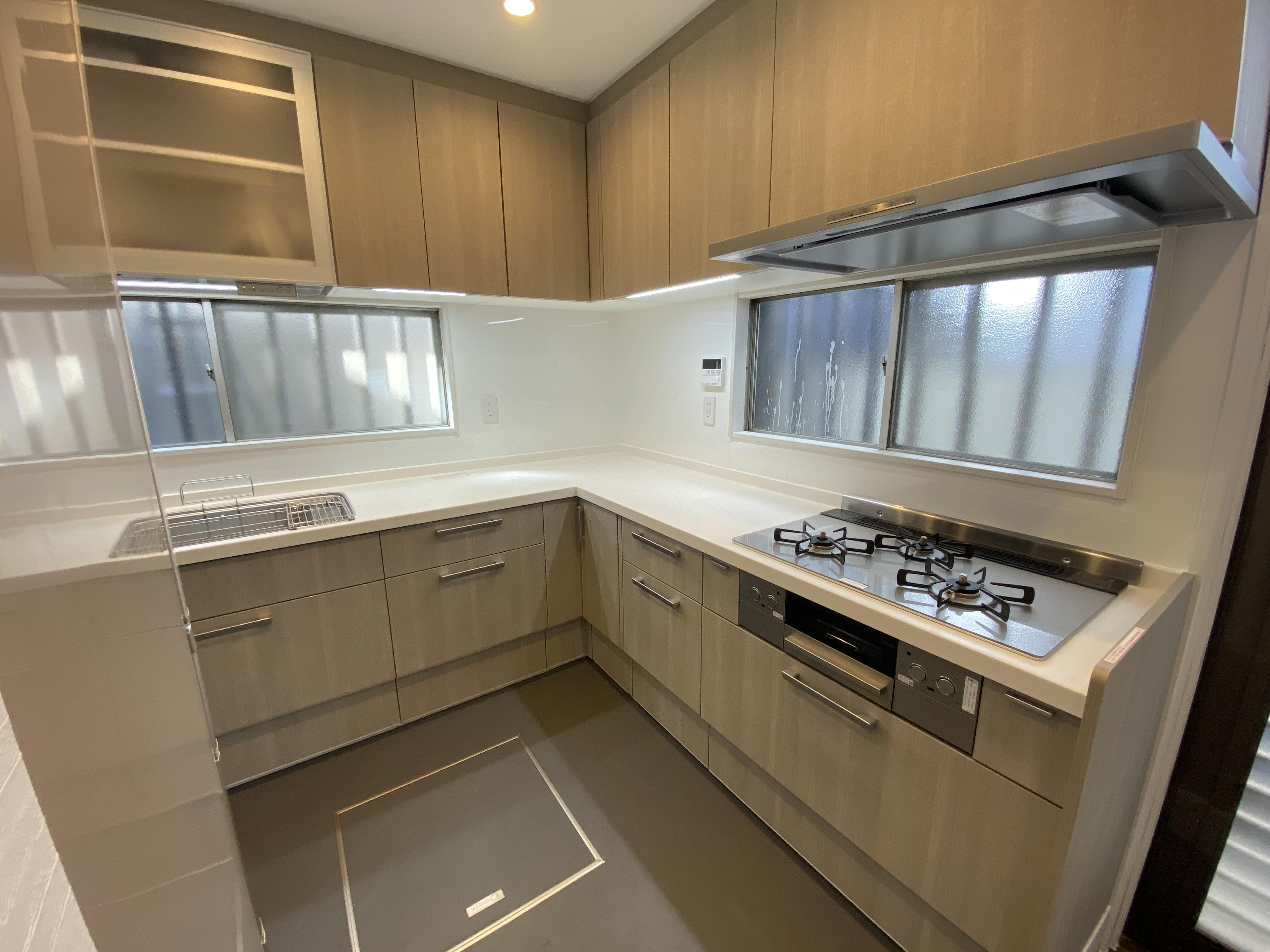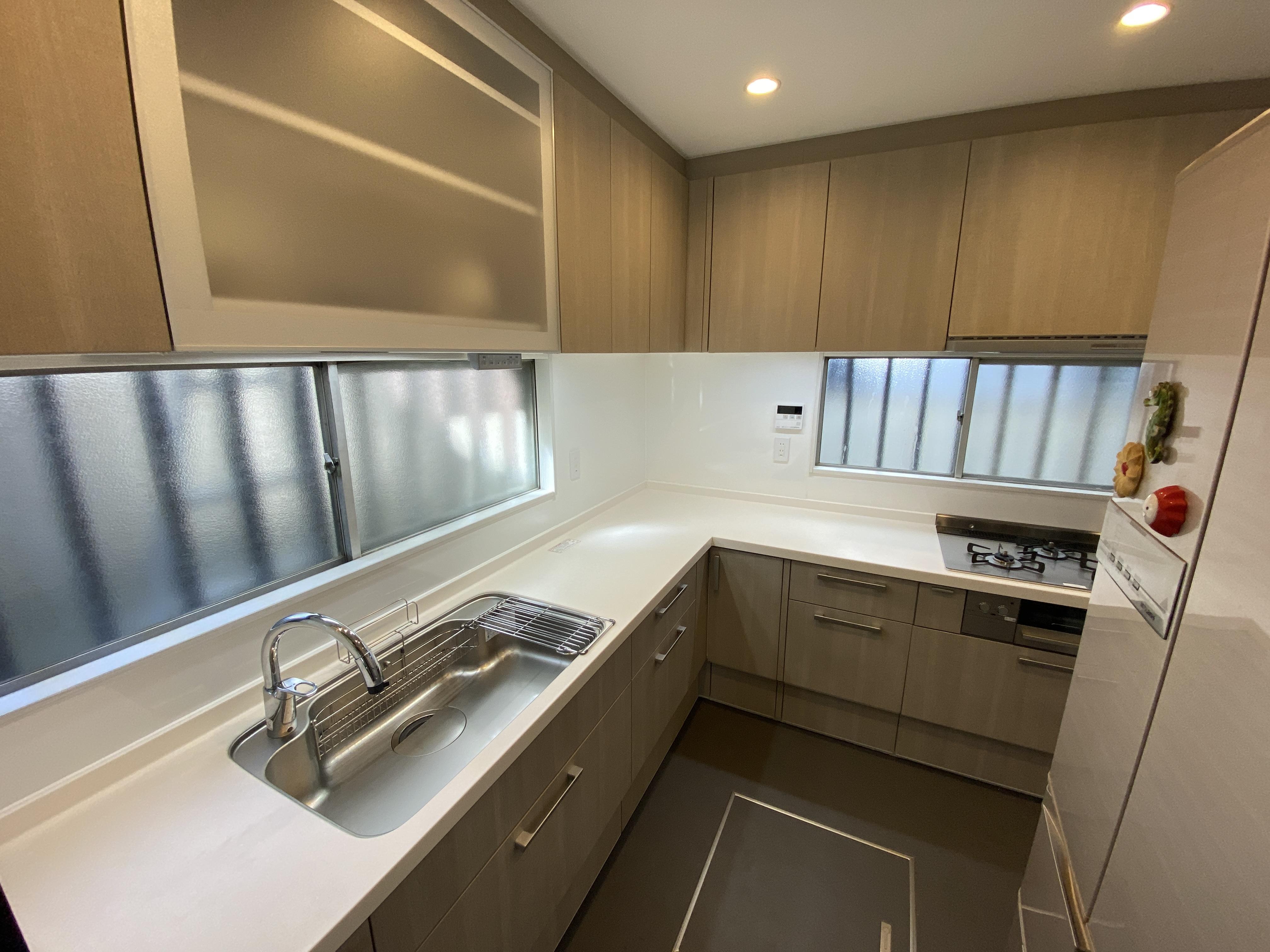 キッチンから湿気と白ありが見られたので、床下の確認をしたところ、隣地の新築工事の振動で、地面が沈み、配管も沈み接続部が外れ、キッチン排水が床下に放出し続け、湿気と白ありの原因となっていることが分かりました。この事を期にキッチン・浴室・トイレ・洗面といった水廻りの全面改修を行うことになりました。解体後地盤沈下していた部分には、トラック一台の転圧を行い、地盤を平らにしました。傷んでいた土台は入替え、下地も入替え、湿っていた地面には、防湿シートを敷き、調湿材を敷きました。これで白ありの好む状況をなくしました。天井・壁・床には室内をくるっと断熱材を入れ、断熱力をアップさせました。ご在宅での工事だったので、お客さまの生活も大変だったと思います。愛犬ちゃんはとても人懐っこく、工事に行くたび喜んでくださって、スタッフが癒されていました!!