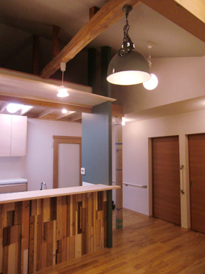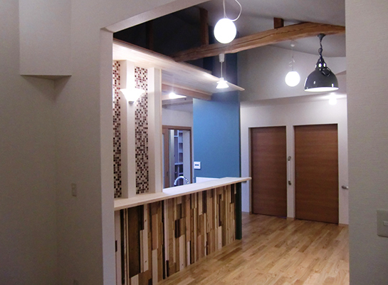 キッチンカウンターの腰壁は、約20種類の古い木材を集めてきてパッチワーク風に取り付けました。奥の扉は、ご両親の部屋。日当たりの良さや、トイレへの導線など、日々の暮らしを考えてプランニングしました。