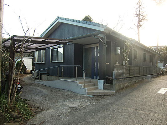 自然の中にある築42年の平屋建住宅を最初みた時は、まるで別荘地のような環境なのに、普通のありきたりの家が不釣り合いだなという印象でした。 南側は崖地になっており6Mも高低差がありました。下は多摩川の源流のようなくねくねとした水が流れていました。 ご両親とも要介護で高齢、お嬢様がお仕事されながら介護されているという状況でしたので、昼間はご両親がお2人で可能な限り生活できるようにバリアフリーや動線の少ない戻間取り、そしてどこかの部分に古い家の面影を感じられるような所を残すこと、そして陽当たりと風通しをよくすること、外観は周囲の緑に溶け込むような雰囲気を持たせることが大まかなイメージでした。 お施主様のご協力を得ながら、結果的には外観はしっかりとした自己主張をしながらも、環境に溶け込んだ佇まいの家になりました。 内部は屋根の傾斜をそのまま室内の天井に取り込んで吹抜に古い梁材の露出した、懐の深いインテリアに仕上がったと思っています。