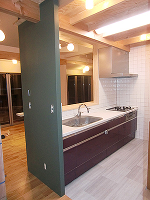 美しいパープル色のキッチン扉がナチュラルな室内にマッチしている。キッチン天井は松ベニヤ化粧根太張。左側の袖壁はアクセントとしてモスグリーンの壁紙を貼りました。キッチンの上はロフトになっています。