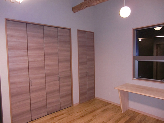 造作家具の机に座ると雑木林が広がる風景が楽しめます。使いやすいクローゼットもつけました。
