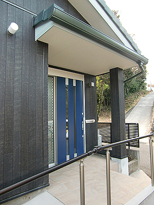 外観は、緑豊かな景観に映えるよう、木目の出た黒い板貼風なサイディングを採用。屋根は強くて美しい新素材瓦ルーガを使用しました。玄関の位置は、車庫の近くに変更し、スロープをつけました。玄関ドアは、引き戸仕様を選んでバリアフリーに対応しました。ブルーのドアがアクセントになっています。