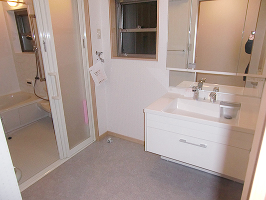 椅子を使用して使えるタイプの洗面台は、引き出し収納もついています。すっきりと使い易い空間になりました。さらに、ご両親は要介護のため、洗面所に相当な介護用品を収納できる棚を設置しました。