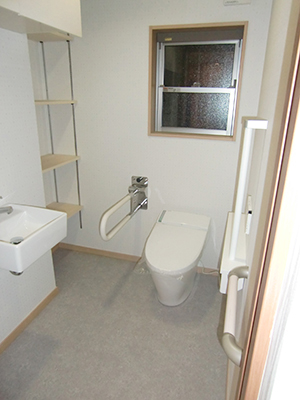 車いすでも使いやすいよう十分なスペースをとりました。固定手すりや可動手すりをふんだんに使い、手前には多目的流しのタンクがあります。便座横には、「はね上げ手すり」も設置。はね上げ手すりは、介助が必要な場合に、手すりをはね上げる事で介助スペースを確保する事が出来る手すりです。