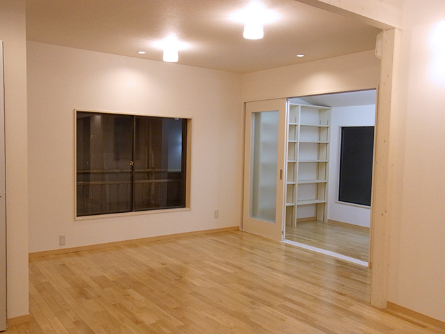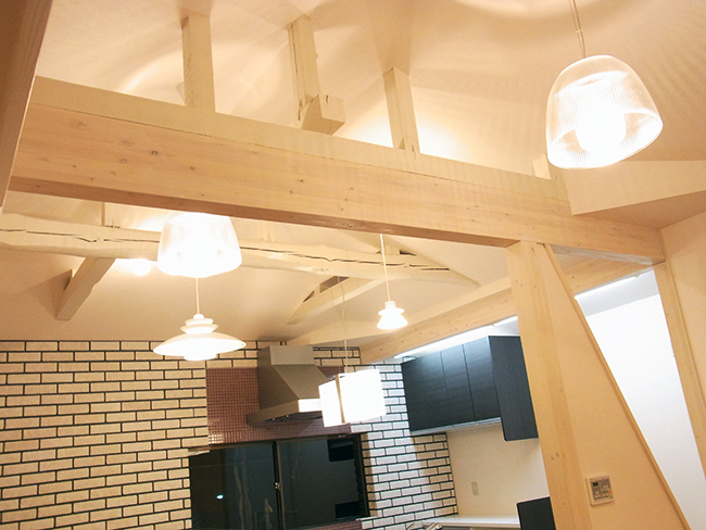 今回のリフォームは、1階ダイニングキッチンを思い切って2階に移設したことにより、約23.5帖の大変広いLDKにすることができました。 又、LDKの天井を全て撤去し、吹抜傾斜天井としたことで部屋の容量が約2倍くらい増え、家の中の空気の流れが出来て、通風・換気の役割を果たしてくれるようになりました。 広々としたLDK空間はとても開放的で気持ち良く、平日・休日共ゆっくり寛ぐことが出来るようになりました。1階を細かい個室とすることで、壁部分が増え耐震的にも有利になりました。 いろいろと条件は必要ですが、2階をLDKにすることで、吹抜化粧天井にすることが出来る、風通しが良くなる、採光が明るくなる、眺望が良くなる、耐震的に有利になる等のメリットも多く、これまでのお客様の中で2階にLDKを持っていって、後悔したというお話はありませんので、もっと積極的に採用出来たらと思っています。
