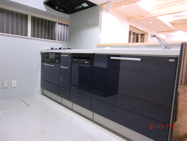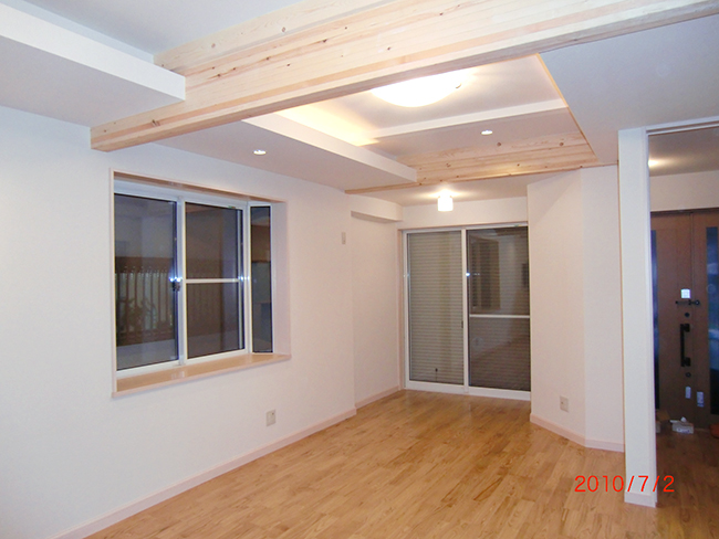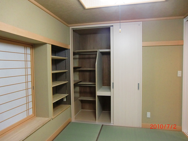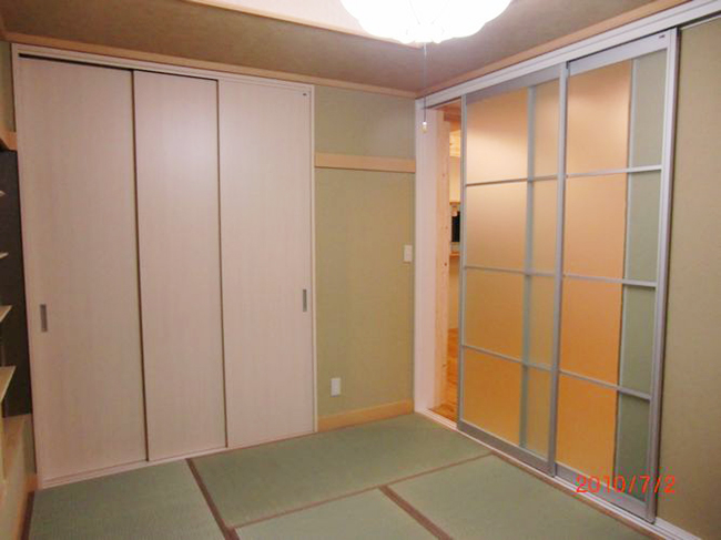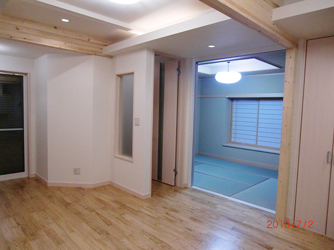 お客様は、通風・日照・湿気にお困りでした。1階和室が湿っぽくカビ臭いというご指摘がありましたので、元々和室のある場所にダイニングキッチンを持ってきました。給排水工事の位置が、大きく移動しましたが、排水管は下流にあたる為むしろ流れやすくなります。今回のリフォームで、既存床をすべて撤去し断熱材を入れて二重床にしたので、湿気はなくなると思います。 リビングの部分は90cm増築しました。リビングの一角に和室4.5畳を創り、建具の開閉により茶の間になったり、趣味の部屋になったり、リビングの一部として使用できる様にしました。押入は吊押入とし、下部に地窓を付け、風が南北に抜けて風通しを良くしました。リフォームでお悩みが解消しましたとの、お客様の声に私どもも大変嬉しく思っています。