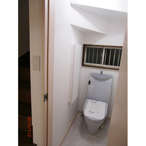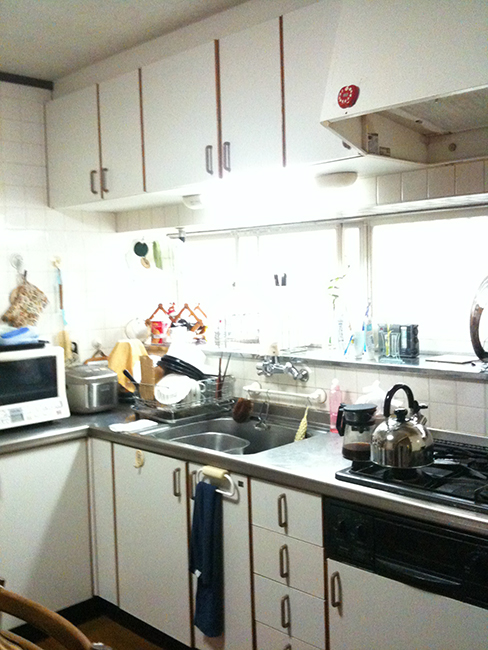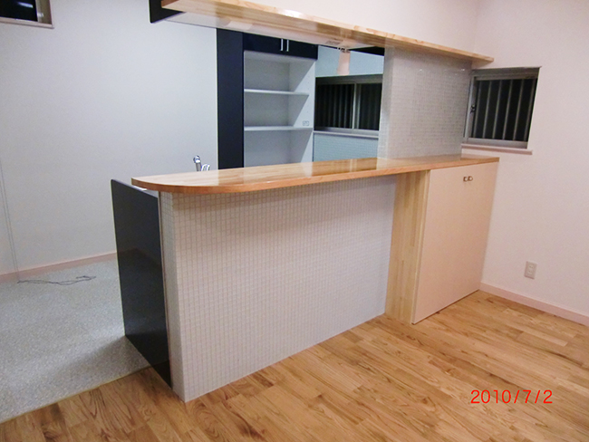 以前は1階の部屋どうしが孤立してて、家全体のつながりがなく、風通しも悪く、カビっぽい感じだということでした。又、リビングダイニングが狭く、家族の団らんがとりづらく、2階の個室に閉じこもるというような状態でした。それらを解消するため、中央にあった廊下をなくし、南側に約1.5Mの増築をしました。結果的には、和室とリビングダイニング、キッチンが一体となり風通しもよくなりました。1階部分の床や壁を撤去し、断熱材を入れ、主要な壁には筋違いの補強もしました。