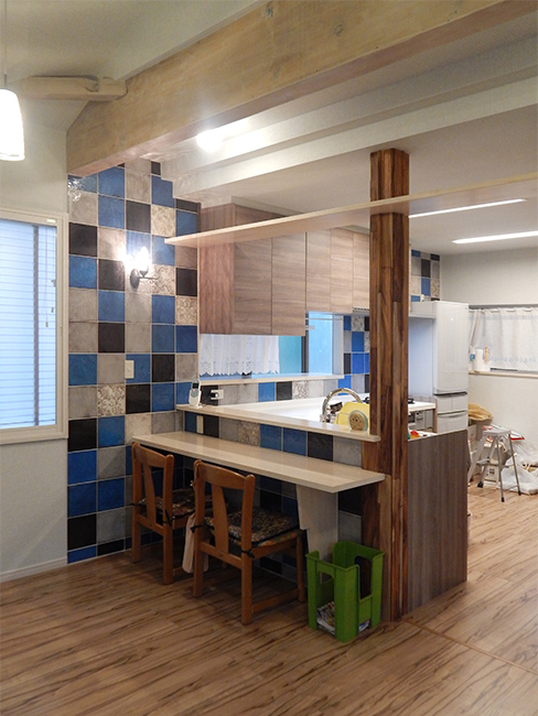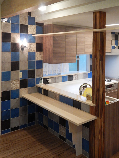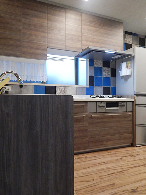 美しい木目の床やキッチンパネルの中でクラシックなブルーのタイルがアクセントになっています。