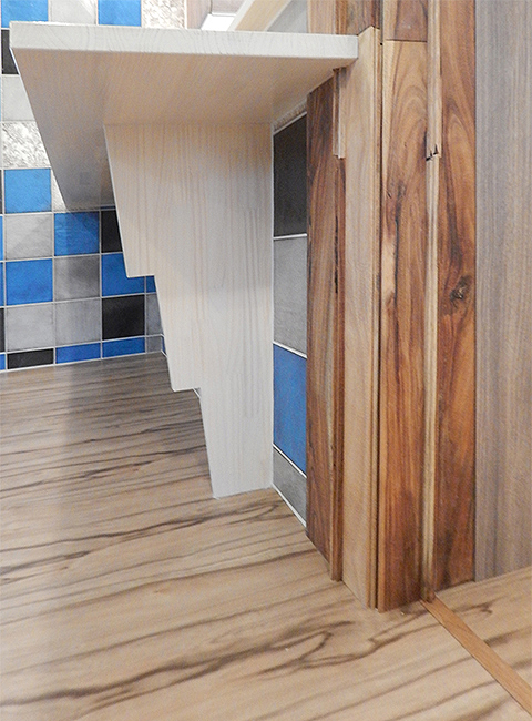 キッチンカウンターを支える支柱には、遊び心を組み入れて階段状にカットし造作しました。