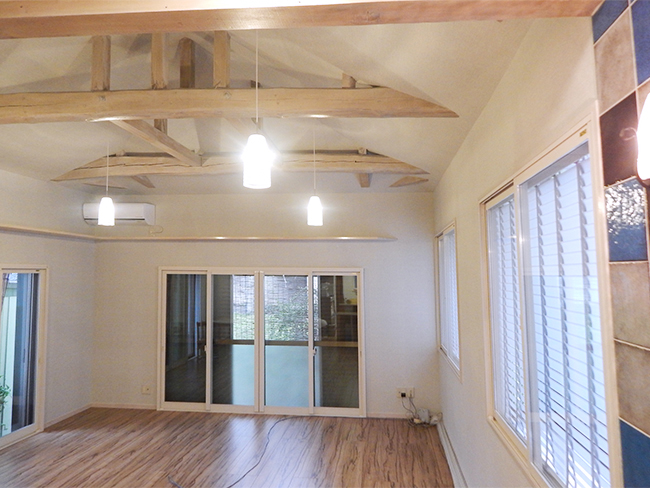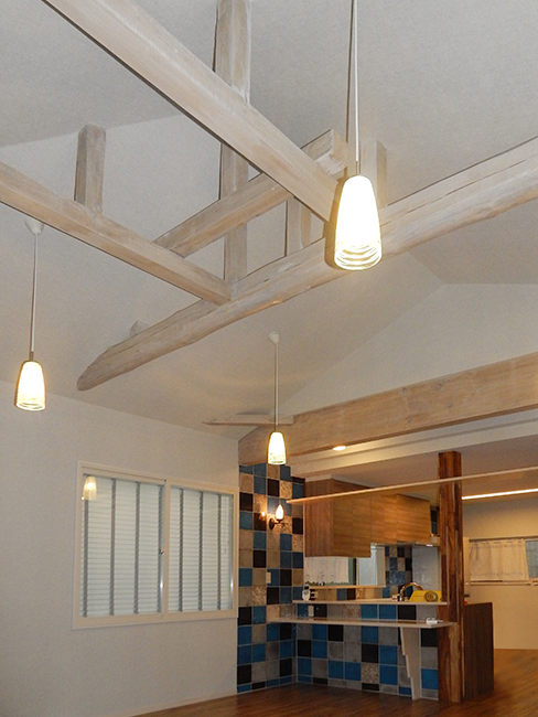 既存の天井を無くし、リビングの天井には吹抜の力強い既存梁が見え、外国風のコテージのような空間をつくり出しました。