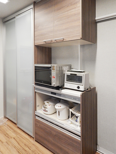 備え付けの食器棚。リフォーム前は収納が少なく家電や小物が溢れていました。今回のリフォームで大容量の食器棚を導入。ごちゃごちゃした印象が出ない様に置き場所を作りました。