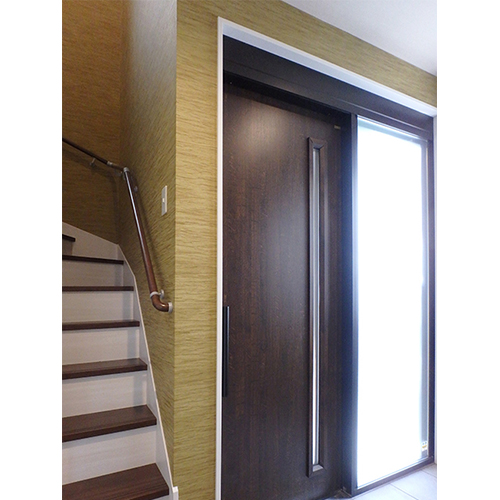 【採光にすぐれ昼間は電気が要らないほど明るくなりました。玄関から階段にかけては綺麗な色のクロスを採用しました。玄関を入ってすぐ2階へ上がる階段があります。