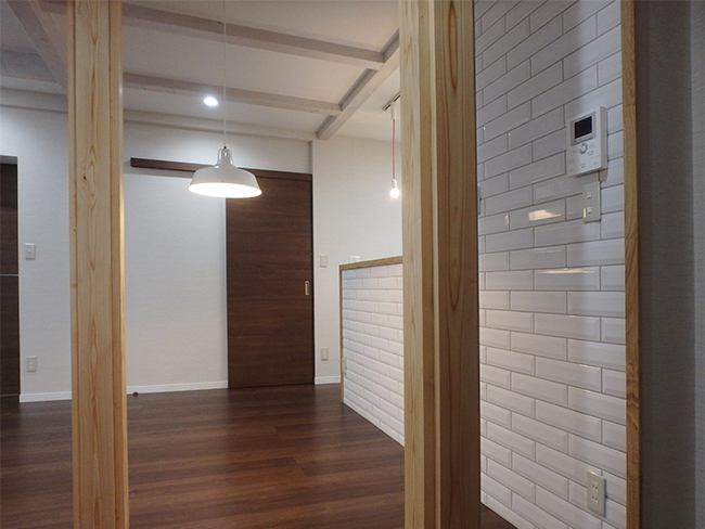横長の磁器タイルを貼ったキッチンカウンターを見る。耐震的に残した柱と補強した柱があります。