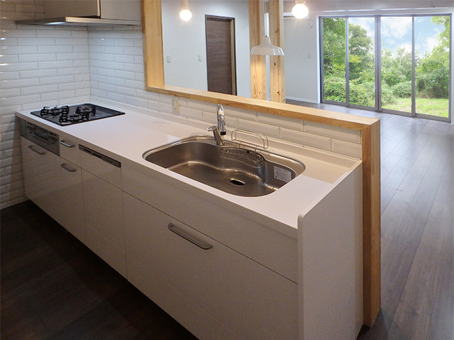 対面キッチンで、お料理をしながらでも家族の団らんに参加できるようになりました。キッチン側にも磁器タイルを貼り、お手入れも簡単です。