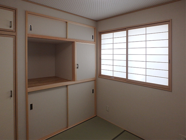 和室には仏壇を置きたいとのご要望をいただいておりましたので、仏壇を置くスペースを中心に収納を造作しました。