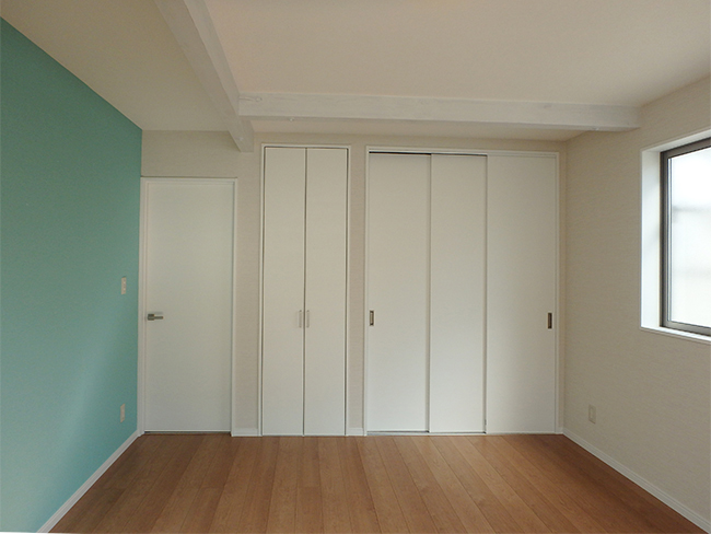 2階のお嬢様の部屋。クロスの色はご本人に決めていただきました。クローゼットはかなりの量を収納できる大型クローゼット。内部には棚をつけて収納しやすいように工夫してあります。