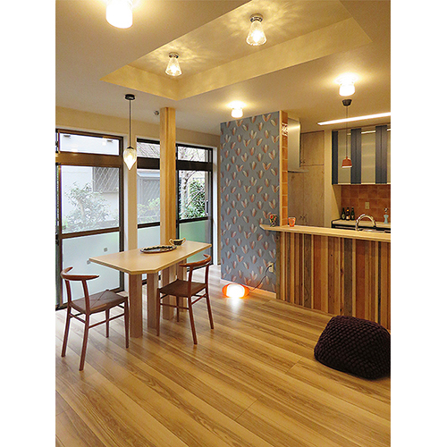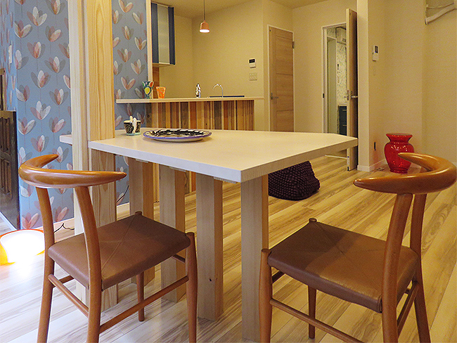 構造補強の柱が目立たないよう、柱と一体化したダイニングテーブルを設置しました。