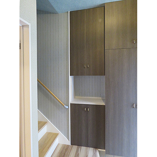 玄関からすぐに緩やかな階段で2階に上れます。2ヶ所の下足入れ収納を設けました。写真左にはお父様の部屋への入口。