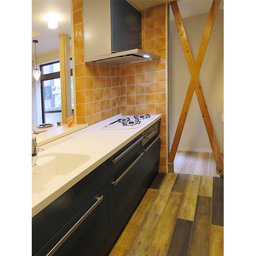 キッチンには、スペイン風のハンドメイドタイルを選びました。キッチンとその奥にある書斎コーナーの壁は筋違い補強を現して一体化しています。筋違いの下をくぐって移動することも出来ます。