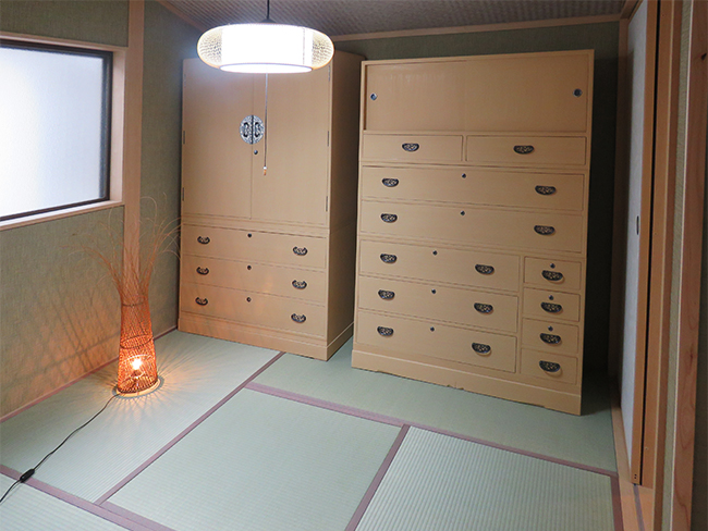 和室の傾斜天井は網代天井、畳のへりは赤い織物の柄を使用しました。お嫁入りの時の桐のタンスもリフォームしてすっかり綺麗になりました。ここはお母様のお気に入りの部屋となりました。