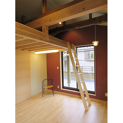 2階の大広間は既存梁と補強梁を露出させ、8帖のロフトを作りました。大広間の外は減築してスペースを確保した屋上テラスになっています。