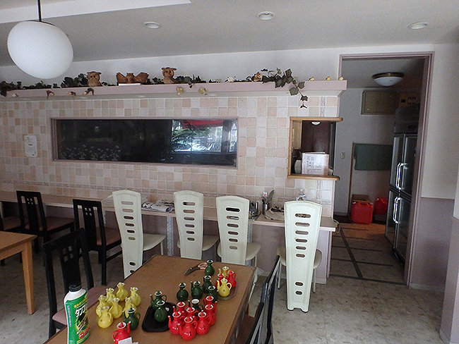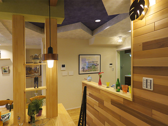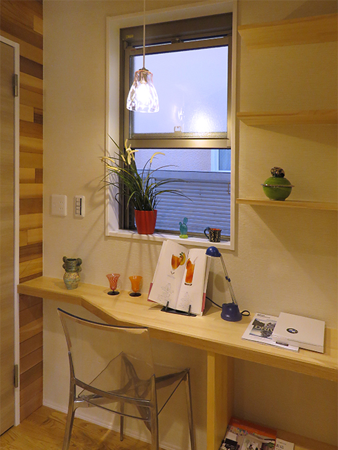 ダイング横には、ワークスペースを作りました。ここにも飾り棚をつくり、施主様の好きな小物を飾れるようにしました。