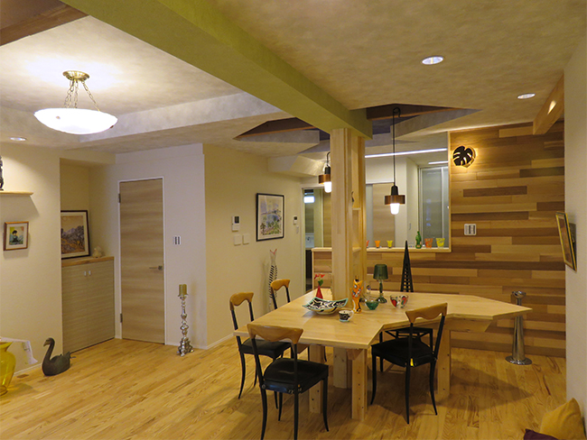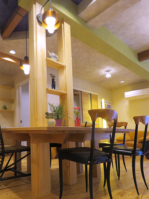 ダイニング中央には8人掛けのジャイアントテーブルを造作しました。中央に構造材に組み込んで作った完全オリジナルのテーブルです。更に大勢のお客様用には別のテーブルをつなげて使えます。