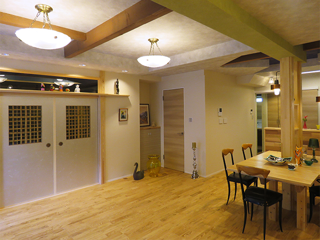 中央の床柱には天然木の幕板を取り付け床の間の地板にしました。さび竹を使い渋い空間となっています。和室の天井も吹上天井にし、大胆な色使いをしました。雪見障子に下地窓を組み込んだ引分戸とわびさびのあるモダンな和室となりました。