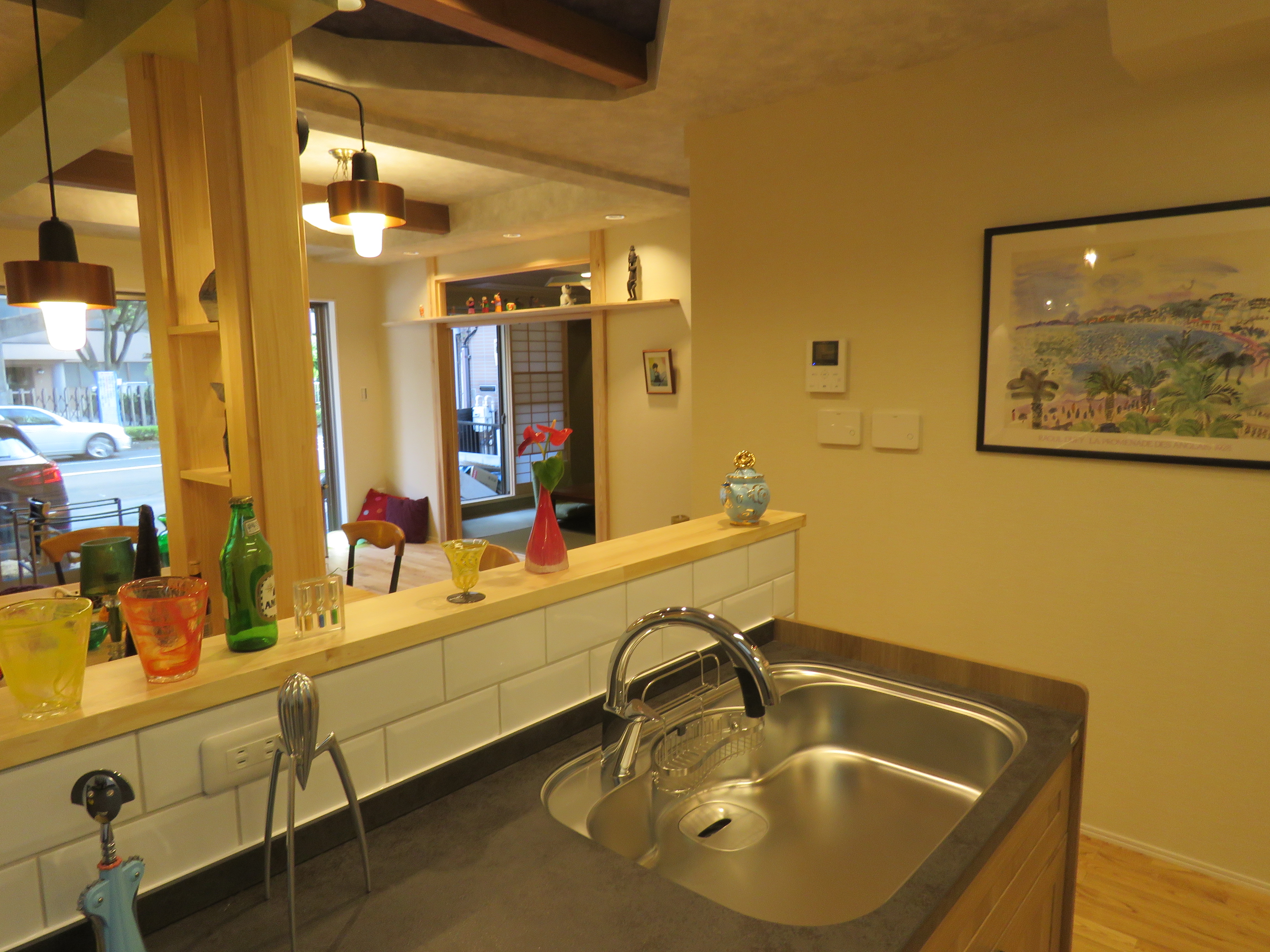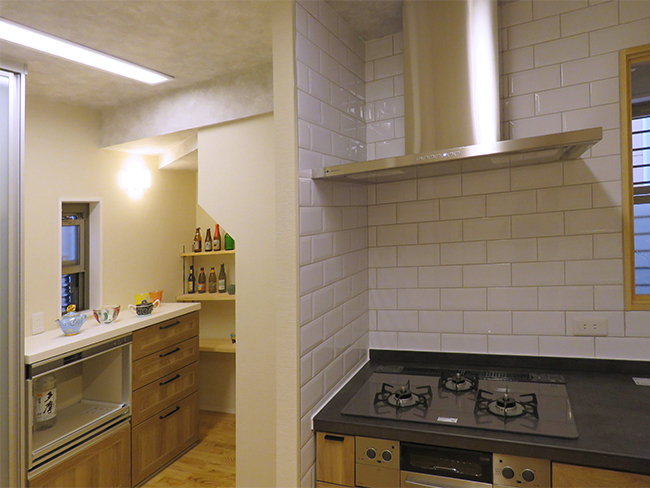 キッチンのワークトップには汚れ・キズに強いセラミックトップを採用しました。前面には磁器製タイルを貼り、お手入れが簡単なキッチンとなりました。