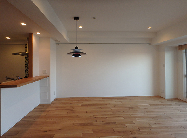 始めて訪問した時にお子さんが素足で室内を走り廻って楽しそうにしていた事が印象に残っており、無垢の床板にしたらもっと気持ち良さそうだろうなと考え、お手持ちの家具類も見せて頂きながら色合いや素材をセレクトしてご家族の好み等も伺いながらプランを立てました。 既存の活かせる部分は残してコストを抑え、新しい部分と残す部分が違和感なく重なる様、配色やバランスを考えプランニングさせて頂きました。