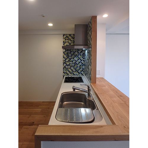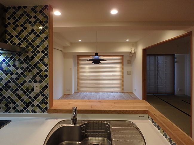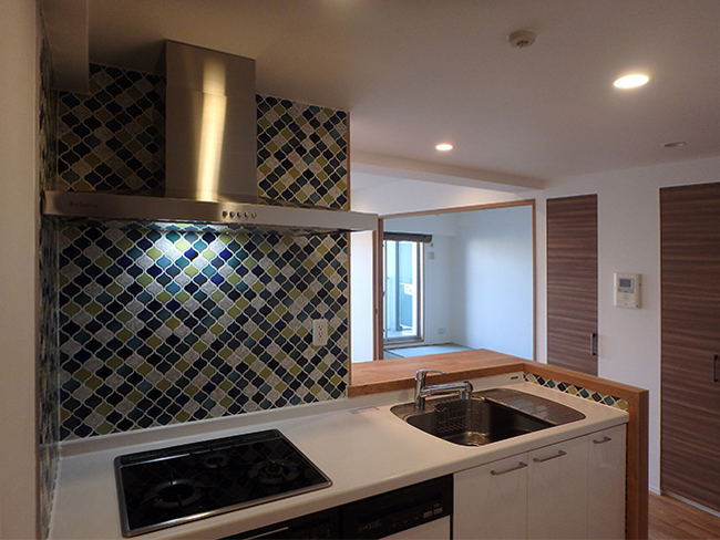 部屋全体のベースカラーは2色で控え目におさえたので、キッチン前のタイルはアクセントとして色付けしました。がらりと印象の違うお洒落なキッチンになりました。リビングの木製ブラインドは、色をおさえたナチュラルカラーとしました。