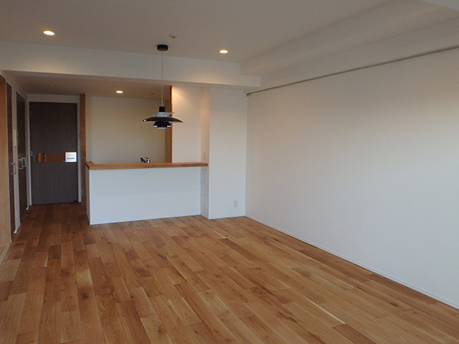 床やカウンターに使用した無垢材は天然木本来の風合いを持ち、室内の湿度を調整する働きもある為、無垢材をふんだんに使用した施主様の室内は、調湿効果により一年を通じて結露、カビなども防ぎお手入れも楽になりました。温かみのあるナラ材の無垢フローリングが、足裏にも心地よく感じて頂けます。