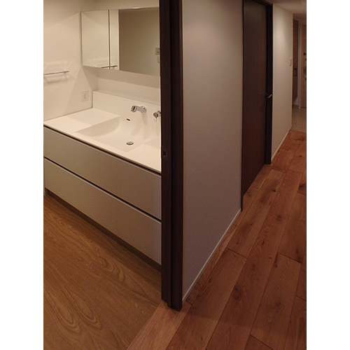 洗面室の床材も無垢のナラ材へと交換。木目が美しく、廊下との統一感も生まれました。