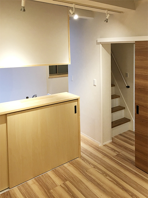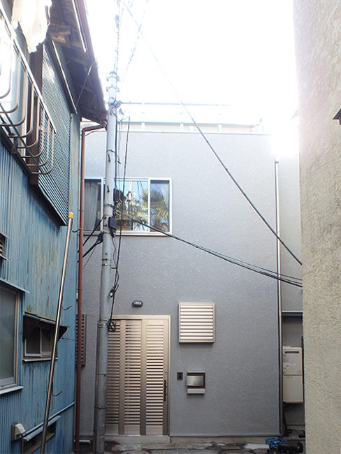 狭い空間に複数の家がところ狭しと建っており、1本の細い通路に接しているだけで再建築不可の土地でした。築70年も経過して増改築を重ねた家を今後長く住み続けるには骨組だけを残してリノベーションするしかありませんでした。一人暮らしをされているお父様と息子様ご家族が一緒に住むのを機に、二世帯住宅にするためのリノベーションを行いました。