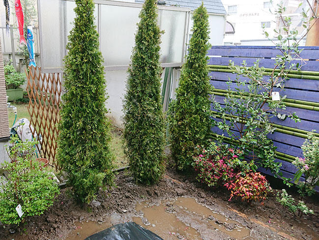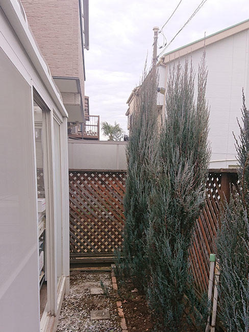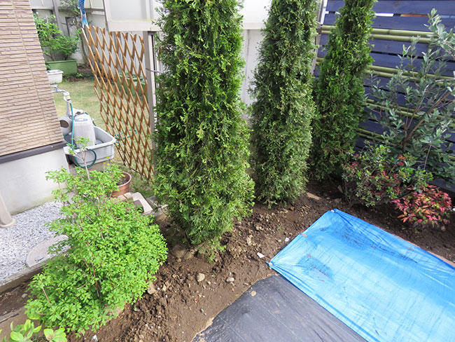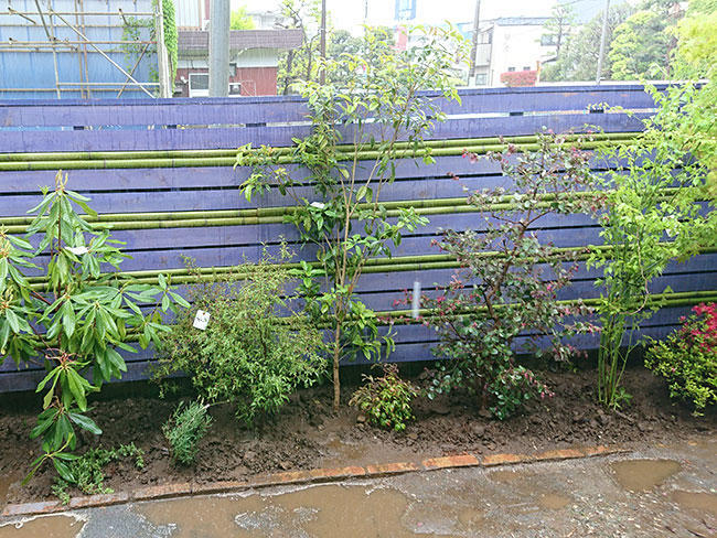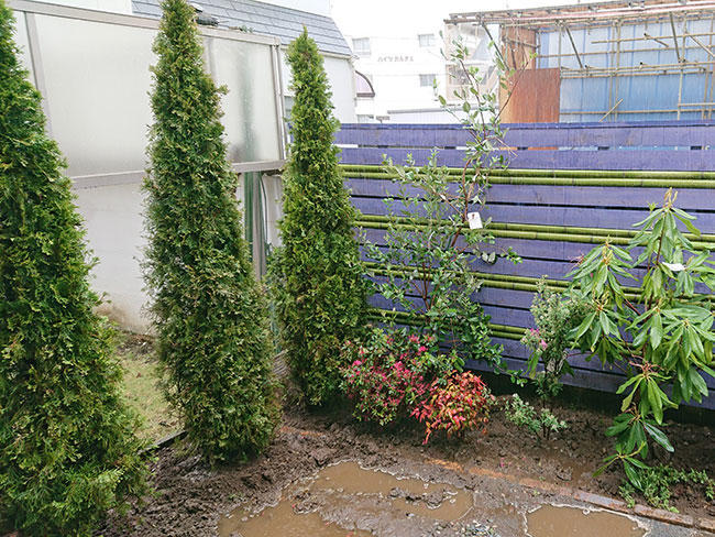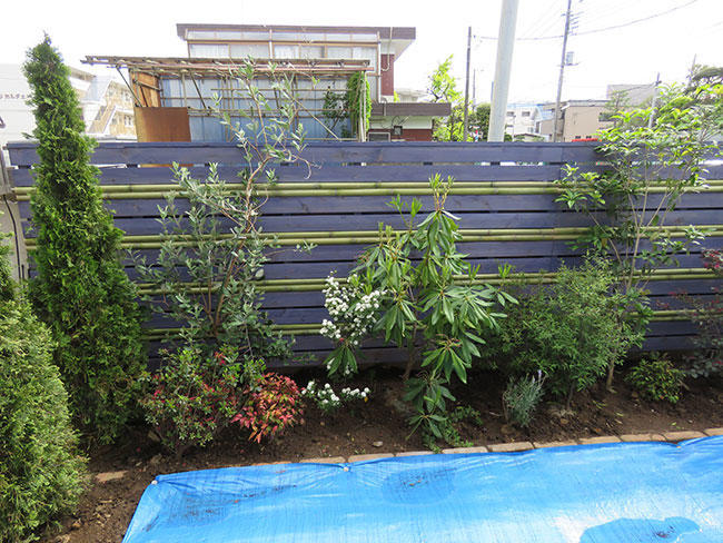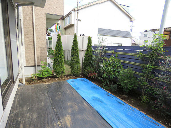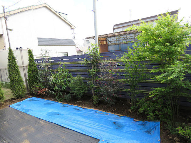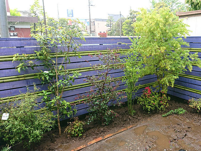 南側と西側に既存の古い万年塀を残し、目隠し用の木として定番のコニファーという常緑樹を3本、モミジの落葉樹を1本に他に目隠し用の低木を2本選びました。そしてその低木の根元付近から庭にかけて約15本位の草花を植栽しました。 日々変化する自然の様子を楽しんだり、育てることができる、和と洋をミックスしたような庭が完成しました。リフォーム後はは高級旅館の庭園のようだとお客様に褒めて頂きました。