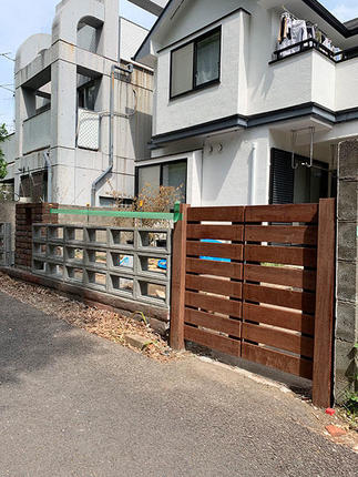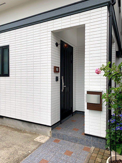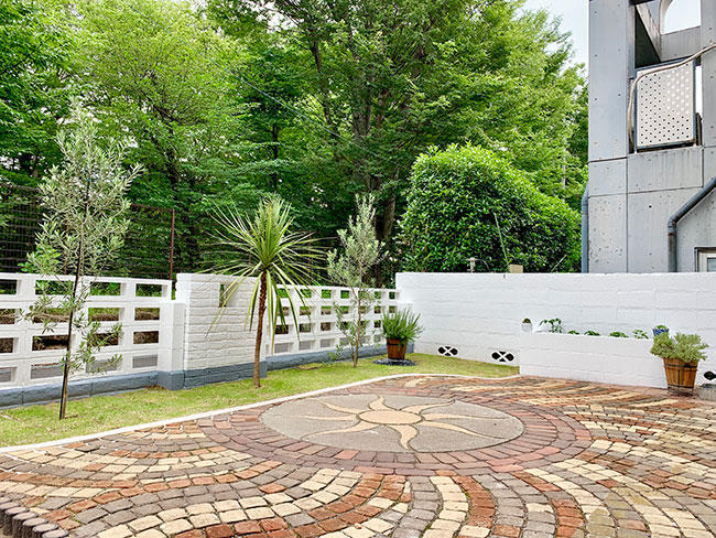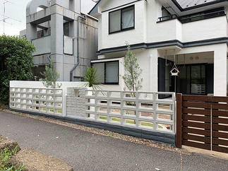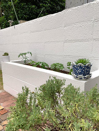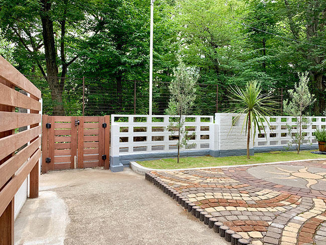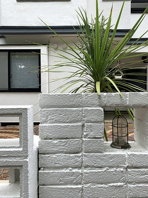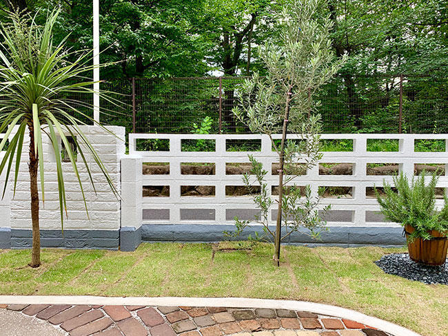 築25年の木造住宅のリフォームが完成しました。既存のアルミ製のアメリカンフェンスや門扉は撤去し、フェンスに隠れた中央のブリック積みのウォールを逆に主張させて、遊歩道の境となるラインにはホローブロックを新設して、圧迫感のない、開放的な境界を作ることで、宅内側から見える遊歩道の背景を損なわせない高さと色遣いに配慮しました。又、敷地内のブロック側には芝を敷き、地植えしても目障りにならないストレートに伸びるオリーブシプレッチーノを2株、これからの成長が楽しめる、程良い高さの青ドラセナの1本立ちをシンプルに配置しました。