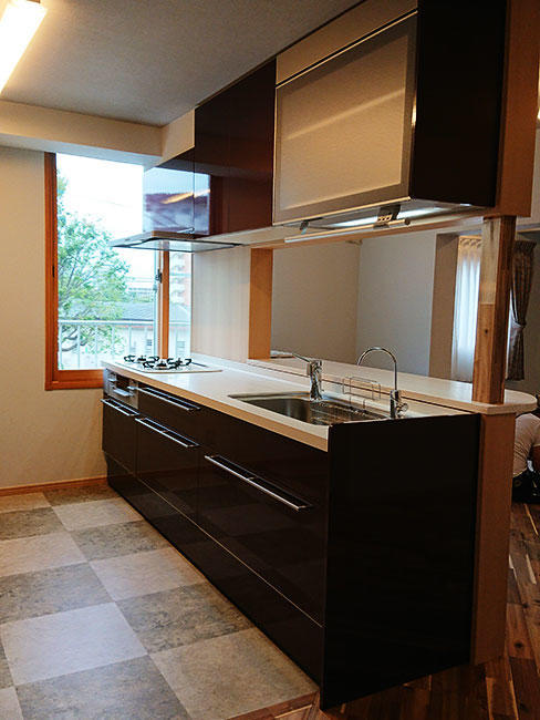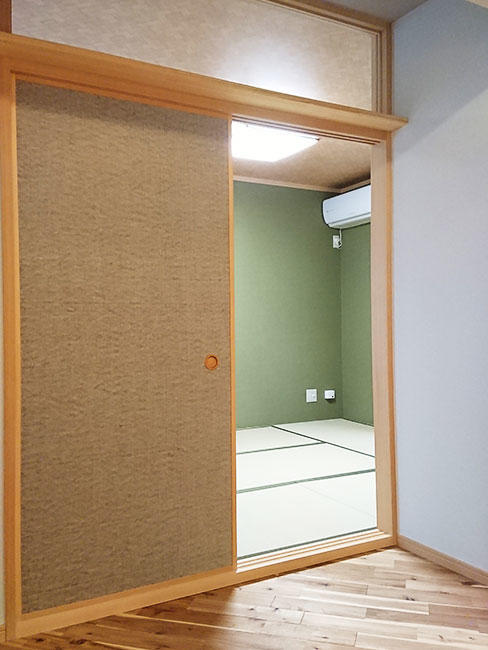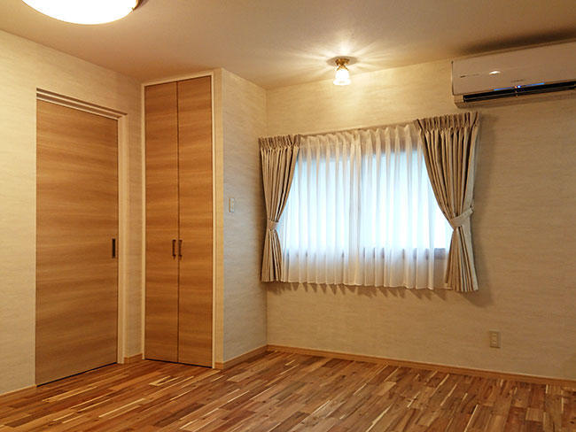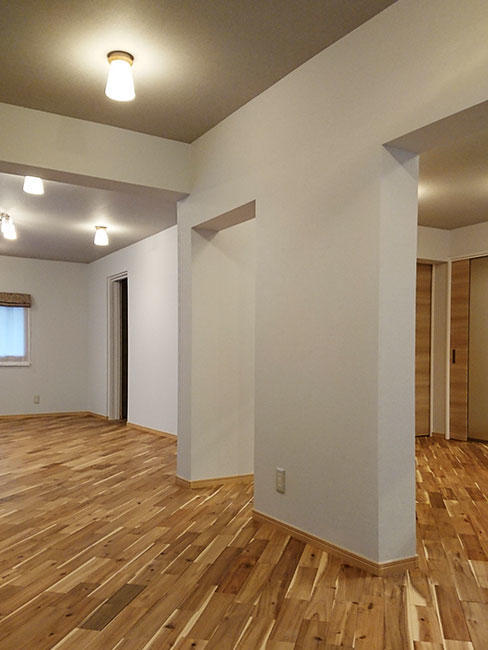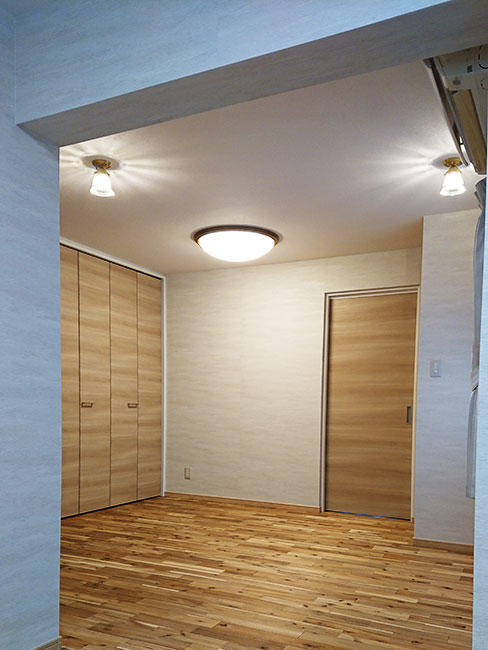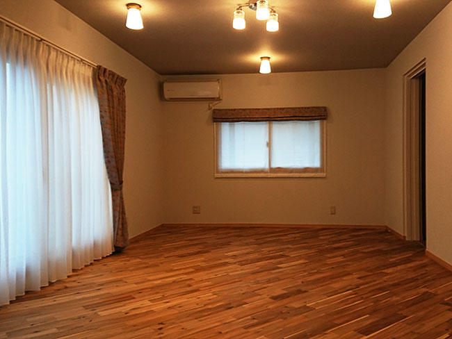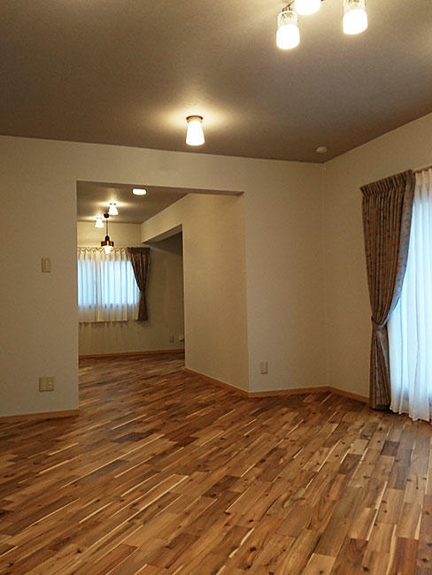 断されていた小部屋を、念願の広々とした大型LDKに変えました。フローリングはアカシアのムク材をセレクトして、部屋がより広く見えるように斜め張りに施工していきました。カーテンの布地は、アカシアのフローリング色によく合う、オレンジ色の植物がアクセントになった植物柄のものをコーディネート。高級感とナチュラル感が感じられるカーテンと照明をセレクトして、全体をまとめています。
