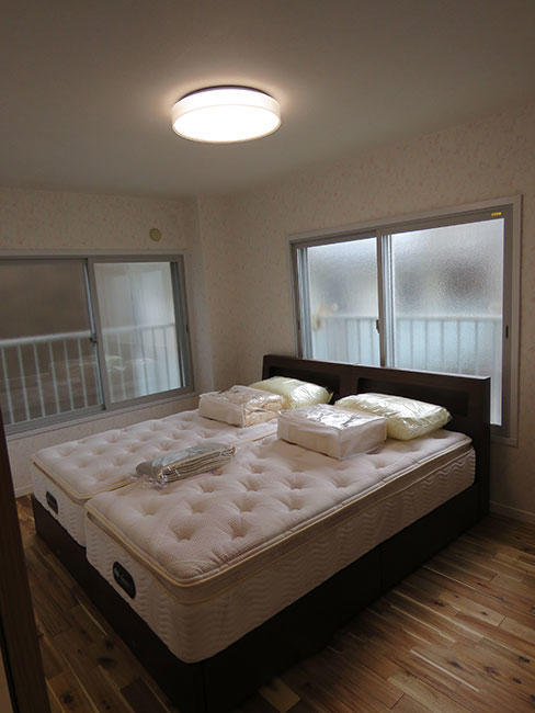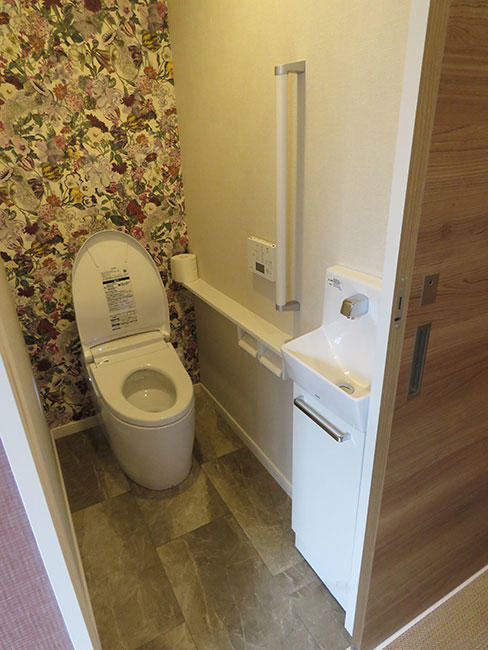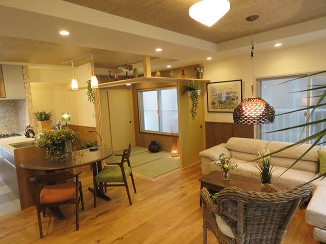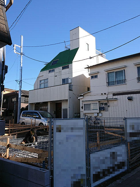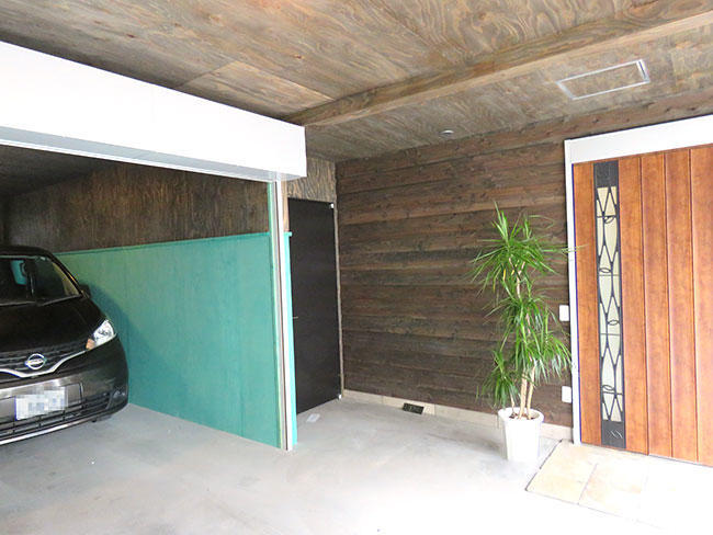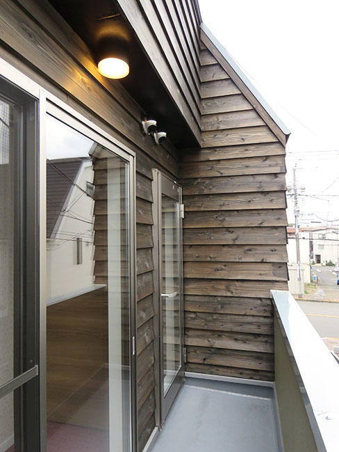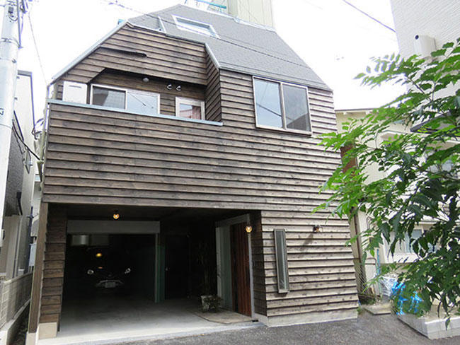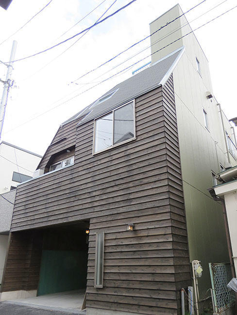 お父様が建てられた築32年の重量鉄骨造3階建ての建物は、比較的駅に近いこともあり、 以前は1階は飲食の店舗が2戸あり、2階、3階が住居でしたが、息子様ご夫妻(50代後半)がフルリフォームして住まわれることになりました。 全体が賃貸テナントビルにしか見えないような箱型の建物をいかに住まいらしくするかというテーマで設計しました。 外観は間口の長さの半分は狭いバルコニーの奥行きを広げて、残り半分のバルコニーは居宅として増築して、2、3階階段ホールを広げ、一体化して多目的ルームとしました。外観は杉板材をヨロイ状に張った南京下見板貼として黒色の塗装を染み込ませた独特の風合いを出すことにしました。1階店舗だった部分は車庫2台分と玄関ホールと半地下のシューズクローゼットにしました。 2階は広いLDKと浴室と奥様が洗濯することがとても好きだというご要望にこたえ、約5帖位あるユーティリティを作り、バルコニーの物干し場に直結することにしました。 LDKは対面式のI型キッチンを設置して、約25帖のLDKとなりました。リビングコーナーには3帖の和室を作りました。この部屋は引き戸を閉じるとお子様が遊びに来た時等に宿泊できる部屋になります。ダイニング・リビング部分は、一部折上天井として間接照明を8系統に分けて、明るさを調整できるようなっています。 3階はご夫妻の寝室と予備室と多目的ルームにしました。 外階段で土足使用だった階段を内階段として取り込んだことによって家全体が実際の面積より大分広く感じられるようになりました。