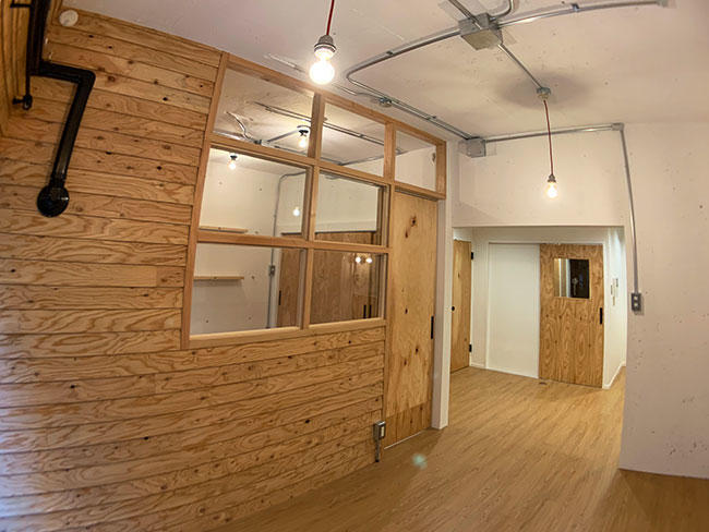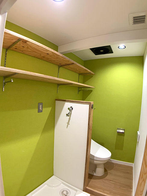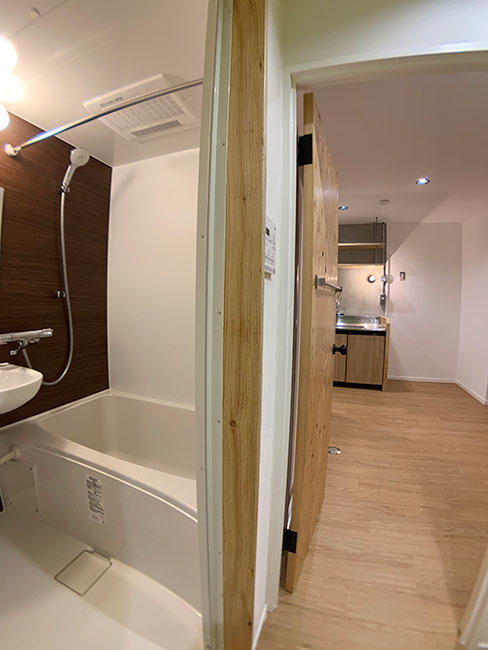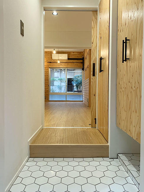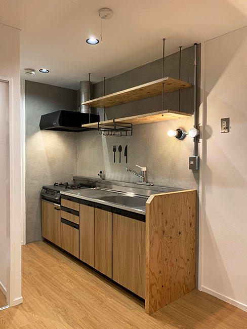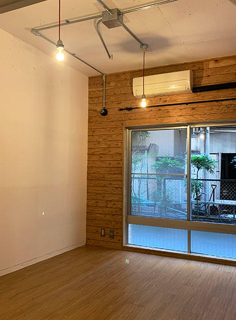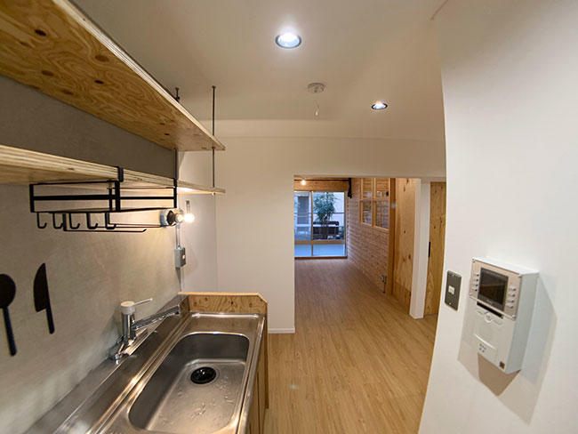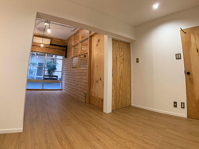 築37年の2DK賃貸マンションを快適で遊び心のある空間へとリニューアルしました。 当該物件は1階にあり、専有部分のバルコニー扉を開けると専用庭から外部へと直接出る事が可能で、住まいとしての賃貸物件だけに留まらず、SOHO(small office/home office) としても利用可能なマルチな物件へと変更しました。賃借人の幅や層を広げる事で単なる賃貸物件では無く、価値ある賃貸物件へ繋がる事も目的にしました。 南側の2間の間仕切りを完全に取り払うのではなく、解放感のあるガラスの間仕切り壁を設けて、プライベート空間と共有部分が視覚的に開放的になる様、心掛けました。 南側に面した専用庭にはグリーンを配置したり額縁の中を自由に彩る事が出来ます。 専用庭に面している空間だからこそ、境をガラスで仕切り、少しでも開放的な空間になる様 心掛けました。 空間自体は天井と壁面の一部は躯体をあえて現して、ホワイト色に塗装。無機質になりすぎない様、建具や壁の一部に構造用合板を施し、温かみのある空間へとリニューアルしました。 キッチン、トイレ以外の水廻りは全て交換。キッチンは交換ではなく、既存の使える部分を活かしながら補修だけで、インテリア空間に合ったデザインへと変更していきました。