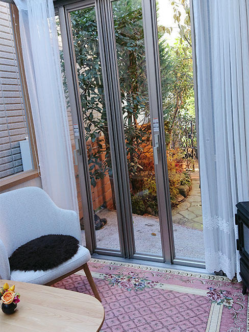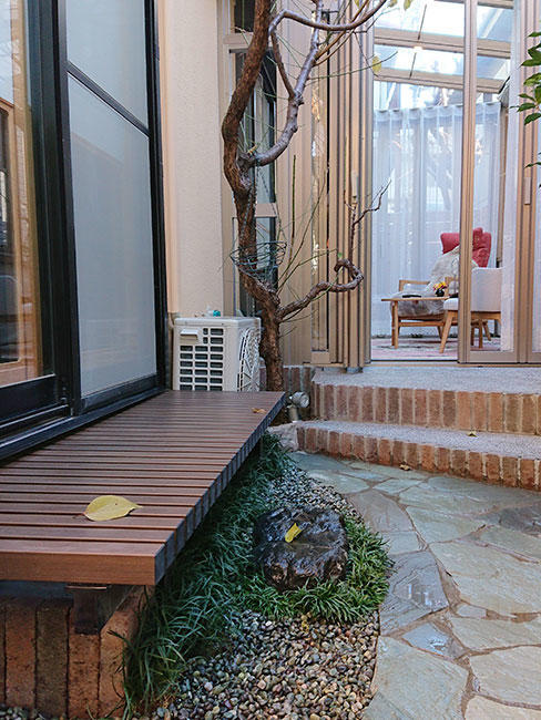 ガーデンルームが完成しました。リビングが2Fなので、庭に面した第二のリビングとして使えるような空間にするため、洋室の前に「ココマ」を作りました。「ココマ」のアプローチの脇に純和風の和室がありましたので、アプローチ部分に、少し和の雰囲気を入れて、洗い出しの仕上げとしました。憧れのガーデンルームが完成し、太陽の光や庭の緑といった自然を感じられる和みの空間が出来上がりました。