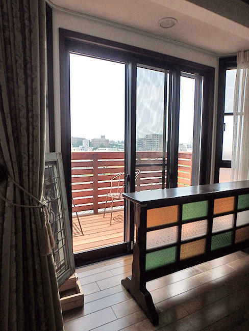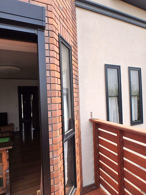 リビングからの眺望は素晴らしいのですが、FIX窓になっている事とベランダが無い為、外に出るには地下の個室から出るか、玄関を出て外階段で庭に回る事しか出来ない状態でした。FIX窓は採風が無く、近年の台風や大雨の際にガラスに叩き付ける風雨がとても怖いという思いから、シャッター付のテラスサッシにしたいとご希望がありました。