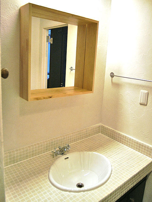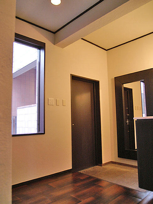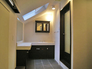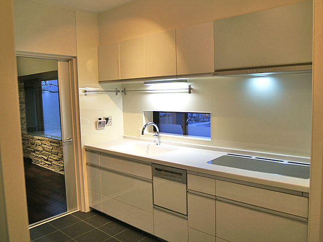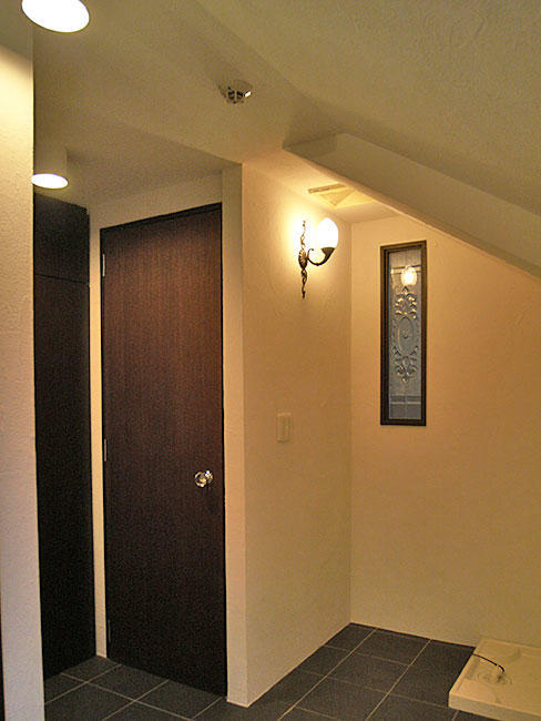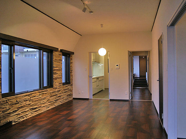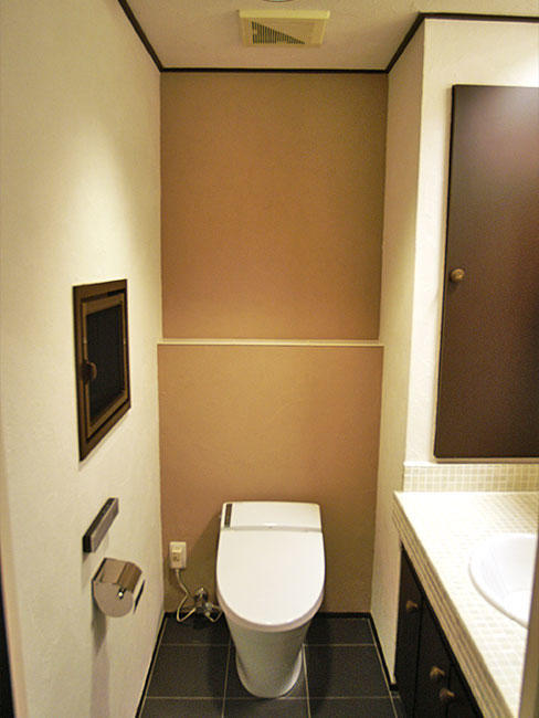 床材は既に遮音フローリングが施されていた為、重ね貼で「カリン材」の突版フロアで仕上げました。 キッチンや水廻りの床材はタイル仕上げとしてタイル下には床暖房を導入しました。 各室のベースとなる壁面や天井材はホワイトの珪藻仕上げとし、居住空間そのものが呼吸をする、健康に気遣った仕上げとしました。 リビングのアクセントとなる壁面には天然石の風合いを再現するセメント系のタイルを施し、温かみのある空間を演出しました。 トイレ内のアクセントウォールも同じく珪藻土仕上げとし、薄めのパープルカラーをセレクトしました。ダークグレーの床タイルが冷たい印象にならない様に配色しました。 広めのユーティリティ・洗面室も冷たい印象にならない様、建具のデザインやドアノブ、照明器具などの小物をクラシカルなデザインでセレクト。モザイクタイルで施したカウンターやシンクが空間そのものに柔らかい印象を与えるよう配慮しました。 浴室は在来工法で、湾曲した浴槽にガラスモザイクタイルをアクセントウォールとし、温かみのある風合いに仕上げました。