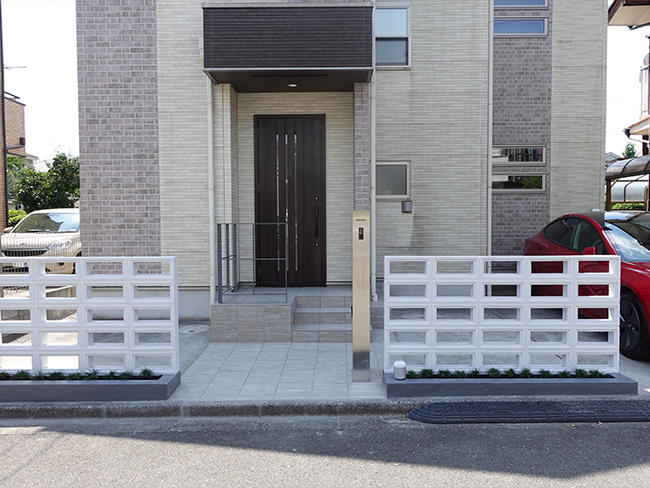 築浅の中古戸建て住宅をご購入されたMさま。 開放的すぎるエクステリアと味気ないアプローチが気になり、自家用車の1台が入庫できて、メリハリのついたアプローチで道路と敷地の境を何かワンクッション置いて欲しいとのご依頼から今回の計画がスタートしました。 元々の玄関ドア前のポーチはとても浅く、ステップの高さも微妙に高くとても導線の悪い印象を受けました。