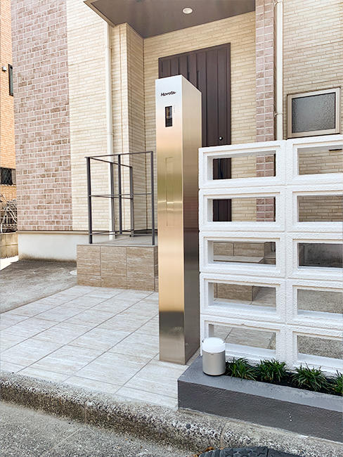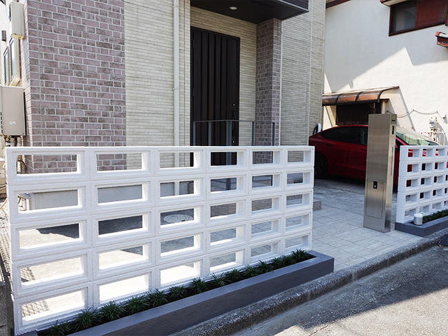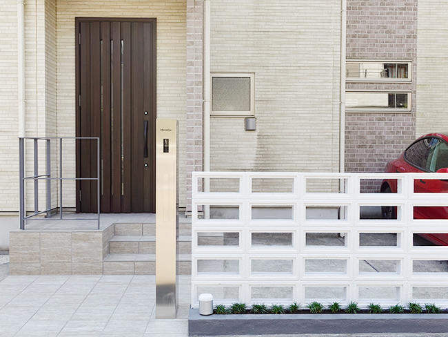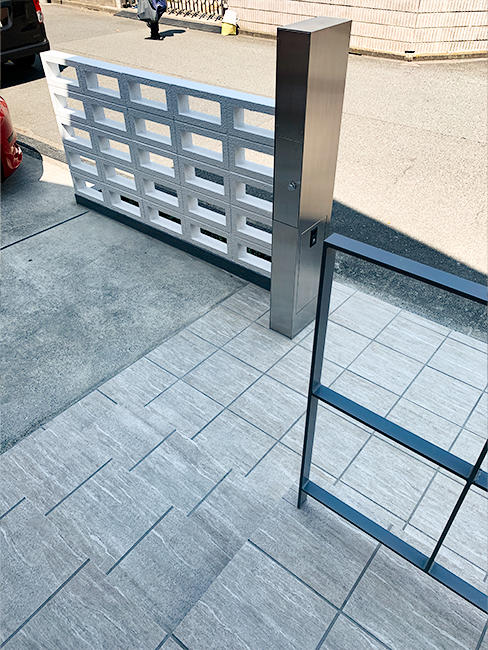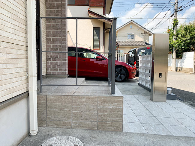 エントランスのステップを1段増やして、奥行のあるポーチに変更。スチールの手摺を設ける事で奥行感とゆとりのある空間へとリニューアル。 インターホンとポストの位置は道路側に配置して、両サイドにホロ―ブロックを新設。 全体のブロックの長さに合わせて、手前側には可愛らしい小さな植え込みを設けました。 ポストは宅配ボックスと一体型のシンプルでスリムなデザインのステンレス製のタイプをセレクト。 今回の計画では、どこにでもある既成のアルミフェンスやスリット状の格子などは意匠的にも普通すぎる為、開放感を持たせつつ、境界を立てる事でメリハリがあり、奥行感も楽しめるエクステリア空間へと変化するように心掛けました。 アプローチはタイルも新規に貼替えて、全体的にすっきりと引き締まったデザインにリニューアルしました。 今後は建物本体の外壁のリニューアルの検討もしていきたいとの事。