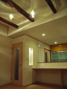 吹抜けに化粧梁を付けた、ナチュラルな印象のリビングキッチンへ
